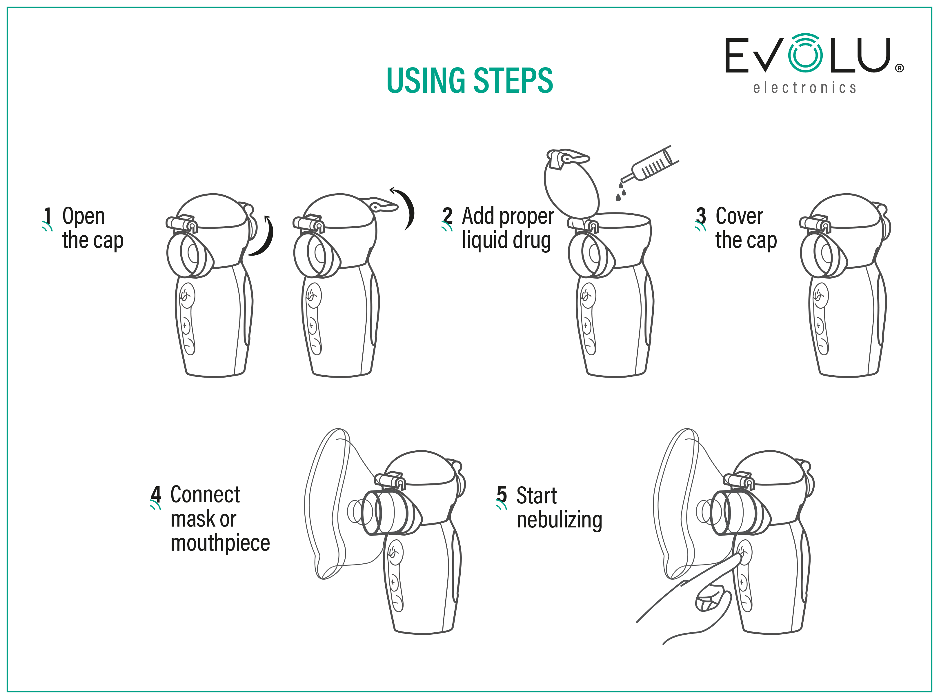EVOLU NANO AIR PRO is a small, silent and lightweight device. Add the medicine and the device is ready - you can carry and use it anywhere.