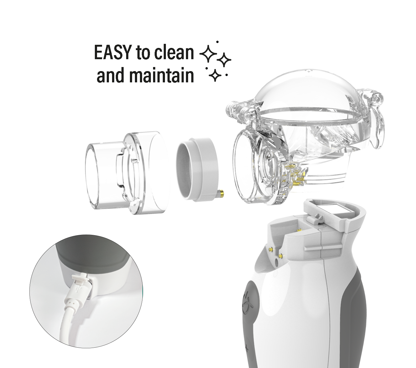 The mediсation cup can be easily installed, removed and disassembled, which makes it easier to care for the product. Removable nozzles make this device easy to disassemble, clean and disinfect. It is compact and powered by a USB rechargeable battery.
