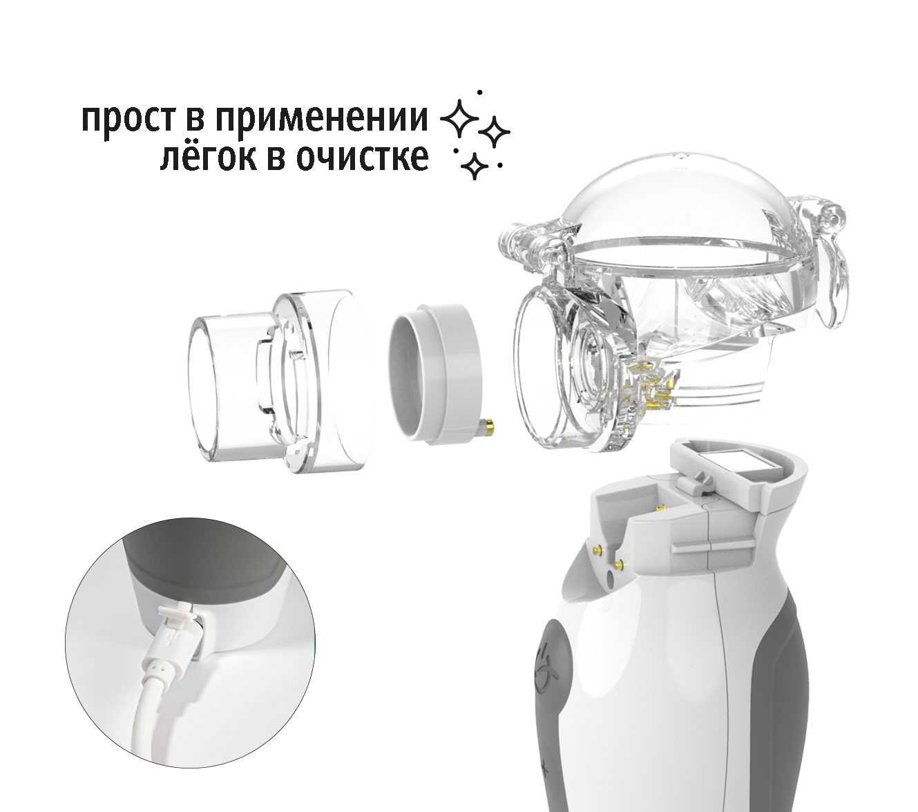Чаша для лекарств легко снимается и разбирается, что облегчает уход за продуктом. Благодаря съемным насадкам это устройство легко разбирать, чистить и дезинфицировать. Заряд аккумуляторной батареи происходит от сети, через USB кабель.