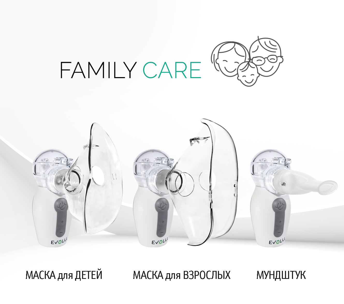- Легко сменяемые насадки: мундштук, детская и взрослая маски;